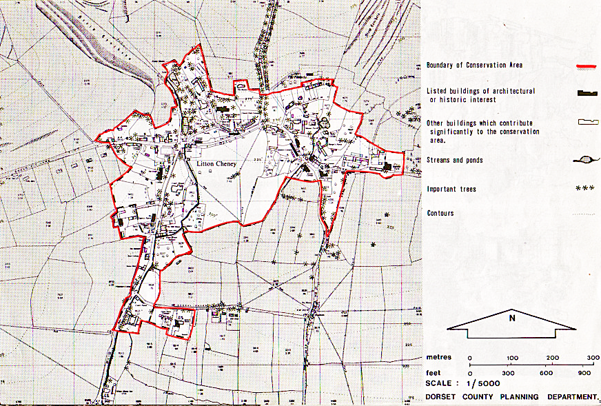 Return to top of Page ABOUT LITTON CHENEY OUR VILLAGE Litton Cheney is a spring-line settlement along the northern margin of the Bride Valley, at the foot of the chalk scarp, about 145m (500ft) below the A35 main trunk road in south west Dorset, England. The village lies within an area of outstanding natural beauty some 14.5km (9 miles) west of Dorchester, 10km (six miles) east of Bridport and 5km (3 miles) from the sea at West Bexington. At the 2011 census the village comprised 195 dwellings housing a population of 359. For a brief history of the village click HERE Return to Top of Page Grade 1: Parish Church of St Mary, Church Path. Grade 2: Chalk Pit Lane: Court Cottages 1 and 2 Townsend Cottages, 2 Charity Farm: Barn 90 Metres West of Charity Farmhouse Church Path: The Old Rectory Hines Mead Lane: Glebe Cottage  Main Street: Barges Cottage Barges Farmhouse Beech House and Attached Front Railings  Village Shop and Forge Attached to Beech House Brewery Cottage Charity Farm Cottages 1 and 2 Charity Farmhouse Cross Trees Farm Cottage Malter's Cottages 1, 2, 3 and 4 Myrtle Cottage Randell Cottage Riverside Cottages 1 and 2 The Cottage The Court House The Mill The Water Mill at The Mill, with Bridge Attached School Lane: Thorners School  St Marys Churchyard: Drew Hodder Monument 2 Metres North East of Parish Church Chancel Monument (illegible) 2 Metres South of Parish Church Chancel Monument (illegible) 4 Metres East of Parish Church Chancel Sweet Monument 4 Metres South of Parish Church Chancel LISTED BUILDINGS in LITTON CHENEY LITTON CHENEY CONSERVATION AREA The following is a reproduction of a pamphlet issued by Dorset County Council in 1972, giving details of the Litton Cheney Conservation Area, plus a revised (2003) map, taken from the first WDDC Local Plan. The latter shows the Conservation Area (slightly changed to include Garden Close) together with a “Defined Development Boundary” and “Land of Local Landscape Importance”.  No development was to be permitted outside the Defined Development Boundary and only limited infilling inside it.  This idea was dropped when the Local Plan was subsequently revised.  The 2003 map also indicates that the whole area shown was of Outstanding Natural Beauty. It is included on the website for interest only.  It is not known whether all, or any, of its content still applies.  Anyone needing up to date details should consult West Dorset District Council’s Planning Department as, since 1972, they have taken over responsibility from Dorset County Council. It is interesting to note that in 1972: •	Manor Farm, Barges Farm and Baglake Farm were still in use as intended. •	Manor Farm and Baglake estates did not exist. •	There was no playing field. •	Garden Close was not there. •	Fry’s Yard had not been built. •	The Garage and its associated bungalow were still there. By 2003 this had all changed. INTRODUCTION  	1.	The Local Planning Authority has designated much of Litton Cheney as a Conservation Area under the Civic Amenities Act 1967. In view of the recent installation of a sewerage system in the area, which is giving rise to pressures for development in the village, the following policy document has been prepared, dealing with both conservation and development. 	2.	Long-term policies for this and other villages will in due course be incorporated in a County Structure Plan; the following is intended to cover the interim period. It is put forward as a guide to the control of development. BACKGROUND  	3.	SETTING.Litton Cheney is a spring-line settlement along the northern margin of the Bredy Valley, at the foot of the chalk scarp, just off, and 145m (500 ft) below the A35 trunk road.The village lies within an Area of Outstanding Natural Beauty, some 14½km (9 miles)west of Dorchester,10km(6 miles) east of Bridport and about 5km (3 miles)from the sea at Bexington. 	4.	PRESENT SITUATION. The mid-1971 civilian population of the parish was estimated as approximately 210 and that of the village 180. In addition to 87 dwellings existing in the village, there were outstanding planning permissions for seven more.(Note: The number of persons present in the Parish on Census night, 25/26 April, 1971, was 190) 	5.	FACILITIES. The village contains the parish church, post office, general store, public house and youth hostel together with a forge, builder's premises and a firm manufacturing precision components. There is a primary school which also serves Puncknowle, Swyre, Kingston Russell, Long Bredy and Little Bredy. There is no village hall or public playing field. 	6.	SERVICES. Main drainage has recently been installed as part of a self-contained scheme covering the parishes of Litton Cheney, Puncknowle and Swyre; it allows for an increase in permanent population, together with a considerable summer population. Water supply and electricity are both available, but there is no gas supply. 	7.	COMMUNICATION. The village is served only by 'C* class or unclassified roads. There are at	present two buses a day to Bridport, two additional ones on Saturdays and one a week to Dorchester. 	8.	PHYSICAL CHARACTER.  The village consists of dwellings built mainly of local grey stone with a yellow or red tinge, and roofs are slated or thatched; brick has been used for chimney stacks and porches. The fine church with its new rectory stands on a knoll above the village. The buildings abut onto lanes which follow no regular pattern, and the whole character is enhanced by roadside streams and associated stone walling, by the numerous trees which provide background and screening,and by the magnificent hillsides above the village.  PROBLEMS. 9. The main planning problems arising from the present situation are:- a) Following the installation of main drainage there is pressure for development which, unless it is carefully controlled, will seriously affect the character ofthe village,the greater part of which is considered worthy of S b) The existing road system is in
