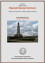 Northover, Reginald GeorgeBorn in April 1884 at Litton Cheney, son of George and Jane (nee Cheney) Northover. Baptised 15th of June 1884..A Litton Cheney Bellringer. Jane Northover died in 1884. George then married Amelia Trowbridge on the 29th of January 1885. George died in January 1888 whereupon Amelia became head of the household.Enlisted on the 24th of October 1904 for 12 years. Height 5 feet 4 inches. brown hair, grey eyes, fresh complexion. Postman prior to enlisting.Stoker 1st Class on HMS Queen Mary. Service No. 307832He died on the 31st of May 1916 at the Battle of Jutland. Body not recovered for burial.He is commemorated on the Portsmouth Naval Memorial, Panel 19.