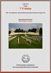 Weller, Thomas Robert Born in July 1880 at Litton Cheney, son of John Weller and Mary Anne Scadden. Baptised on the 5th of September 1880. Litton Cheney Bellringer.Thomas’s father died in January 1890. In the 1891 census he is living with his mother and grandmother.Thomas’s mother died in 1891. In the 1901 census he is shown as an assistant to dairyman Richard Fry.On the 1911 census he is shown as Tom Weller, aged 30, Farm Labourer, boarding at The Mount with the Trevett family. During the war he was a private, with the 1/1st Bucks Battalion, Oxfordshire & Buckinghamshire Light Infantry. Service No. 4802.He fought in Flanders, France and died on the 24th of August 1916 Buried in Etaples Military Cemetery, Plot IX. Row F. Grave 16A.