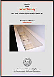 Chainey, William JohnBorn in Litton Cheney in 1886, the son of Eli and Elizabeth Chainey. Baptised on the 31st of October 1886.On the 1911 census for Bridport he is shown as living at Clayhanger, servant to George James and Cora Maud CoxDuring the war he was a private in the 2nd Battalion Dorsetshire Regiment. Service No. 16907He fought in Mesopotamia where he died on the 25th of March 1917Buried in Al Basra War Cemetery, Iraq. Plot: Panels 22 and 63.