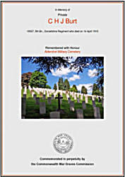 Burt, Charles Henry James Charles was born in Litton Cheney the son of Abraham and Sarah Burt. This must have been during a short period of residence there as his family stemmed from Halstock, Misterton and eventually Long Bredy.Although he was born in Litton Cheney, Charles does not appear on the Litton Cheney war memorial as his family were living in Long Bredy at the time of his death and, presumably, did not ask for his name to be included on the Litton memorial.During the war Arthur enlisted at Misterton and became a private in the Dorsetshire Regiment (5thBattalion) Service No. 10557. He is buried in Aldershot Military Cemetery.Family details HERE