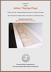 Prout, Thomas ArthurBorn in Corscombe, Dorset, the son of Thomas and Mary Prout. He does not appear on the Litton Cheney war memorial, his association with the village being through his father, Thomas, and his grandfather, Levi, both of whom were born there. The family were living in Sherborne at the time of his death so his name appears on the memorial there rather than in Litton Cheney.During the war Arthur enlisted in Dorchester and was a private in the Dorsetshire Regiment (1/4thBattalion), Service No. 201229. He died on the 2nd of August 1918 in Mesopotamia, aged 24. He is buried at Baghdad (North Gate) War Cemetery in Iraq and is also commemorated on the Sherborne War Memorial.Family details HERE