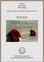 Darby, William JohnBorn in 1886 at Burton Bradstock, son of Richard & Anna Darby.During the war he was a Lance Corporal in the Royal Marine Artillery. Service No. PLY/4689He died on the 5th of April 1917 on SS Calliope after she was torpedoed by the German submarine U-65 (Hermann von Fischel)Buried in Trapani Town Cemetery, Italy, plot I, row 4A.