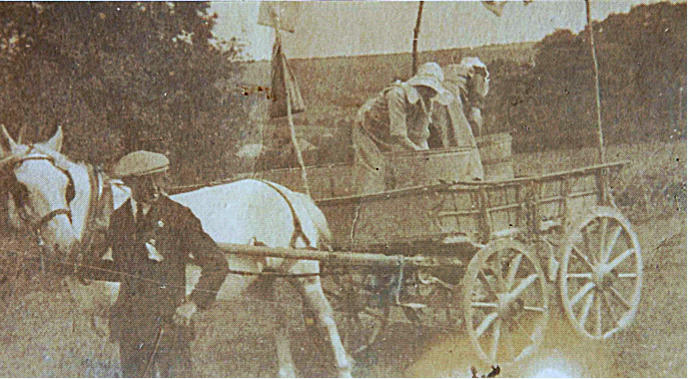 Bert Coombes, VE Day celebrations. Two washerwomen on the farm cart