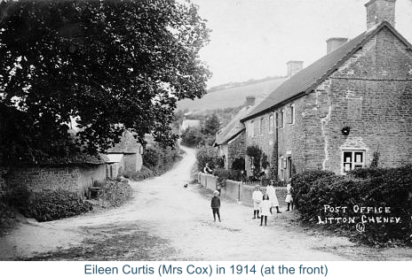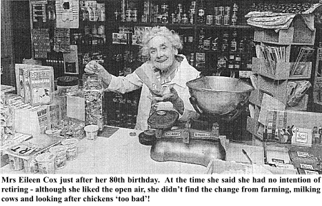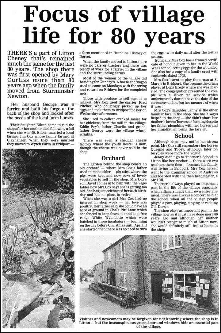 THE VILLAGE SHOP - June 1992 Jennifer Maureen Cox, known to most of us as Jenny; a small, stoical and independent lady. She had her regular habits, including a daily walk around the village, and we always knew where to find her on any given day of the week. She never admitted to a day's illness and had never had a day in bed, but was unfailingly polite and ready with a smile to affirm that she was well, thank you, even when looking up from her wheelchair a week before her death. Her story started when, after seven years' engagement, a young couple had saved enough money for their cousin Ron Jeffs to design them a bungalow called Litton.  Six years later Jenny was born of Jim and Eileen Cox in that bungalow on Burton Road, she was their second child. Her older brother David was born four years earlier in the same house, and a second generation would later be born there too. Shortly before Jenny's birth her paternal grandfather, George, had died, so her parents moved down the road into the farm house at Wych with Maud and Gran Cox. Wych Farmhouse had four bedrooms but no electricity until the 50's. Maud disliked the new electric so the house was still usually lit by oil lamp. Wych Farm  was where Jenny grew up, cycling into school in Bridport, first at the Convent then The Grove School. The extended family all kept closely in touch; the Jeffs kept a caravan on the farm and the Tappers would bring their tent, so the summers were full of cousins camping on the farm. At Wych there were two small 'heavy horses' for the work on the fields, where corn and flax (used to make local rope) was grown. After the death of one horse in 1943 a Ford Standard tractor was purchased. There were always at least two dogs and many cats, all with a useful purpose, living at the farm. In 1958 David bought a whippet.  Days later the back door was opened to find a bundle of fluff left on the doorstep as a present for Jenny. The fluff proved to be a border collie dog given to Jenny by neighbours.  Monty learnt to drive out rabbits from the fields and Zoe the whippet caught them.  Monty was to live a long life in the comfort of the indoors, curled up on an old car seat under a blanket with Zoe. The dairy herd also boasted a bull which was brilliantly named Willy. As well as cows, the farm had pigs and plenty of chickens. When Jenny was a teenager she was in charge of these chickens. She developed an egg round and would load up her bicycle to deliver the eggs to regular customers, adding metal jugs of milk to the load. She became a bit of a favourite with some of them who occasionally left her small gifts. In the winter of 1963 there was a fire at the farm that destroyed a barn full of winter feed.  At four in the morning  Jenny cycled across the fields in the dark to alert  her brother David who lived on West Cliff. They rushed back to assist the firemen. Family habits included a roast beef Sunday lunch, cooked in the Rayburn in the lounge, with both grannies at the table. Attendance in church was at least once, often twice with Sunday School for the children. Whilst they lived on Burton Road they were members of St. John's in West Bay. The radio would be a source of entertainment. They listened to ITMA comedy and "Ray’s a Laugh". For years Jenny had to put up with listening to the The Archers because the other women liked it.  The family would attend the operatic shows in Bridport, whose cast would often include members of the Roberts family, who would later become David's in-laws. Jenny's other grandparents lived in Litton Cheney running the blacksmith and village shop. Her grandfather George Curtis had died the year before Jenny was born and May, known as Little Gran, had continued with the shop. Eileen and Jenny frequently travelled to Litton, for years using bicycles, to help May, especially as she grew frail with age, until her death in 1967. It was then decided to give up the farm and have a change of life style. Settling into Beech House the two women ran the shop and Jim turned the large expanse of land into a profitable vegetable plot to supply the shop. The orchard at the bottom was put to the traditional and infamous use of cider making. Jenny, then in her late twenties, always had her extra jobs. This time she became a house keeper to a local lady. Also people would phone the shop to leave a shopping list and Jenny would later deliver the boxes to individual houses. If there were workmen regularly in the village Jenny would make sandwiches to sell to them. When it was time to 'shut shop' the shutters were closed and tea was laid, but the evenings were always interrupted by knocks at the house door by villagers requesting the little things they had been unable to purchase during the day. Jenny decided it was time to learn to drive, it took several years, but she had a very patient teacher in Jim Collins. Eventually she gained her licence and happily tore round the windy local roads in her little cars. Every Wednesday would be 'cash and carry' day. The trip to Dorchester always necessitated egg sandwiches to be made, because egg sandwiches were always made, back in the day when the trip had taken far longer! Her travels took her across the stretch of Dorset to visit family or friends. And she continued the habit, started in her youth, of taking an afternoon Sunday drive, offering when possible to take dear friends out with her. Eileen played the organ and Jenny joined the choir at St. Mary's in Litton. She was a member of the women's institute. She played whist and bingo.  She had pen friends from the days of her youth. She had a legendary skill, or knack, of winning things, but refused to play the Lottery. Her 'Jenny Cakes’ have also become a bit of a legend of their own; she made two types, lemon drizzle and farmhouse.  Each and every time they came out perfectly. If ever she knew that family was visiting she would make a cake for her visitors to take home, in bags stretched with the weight of them. 