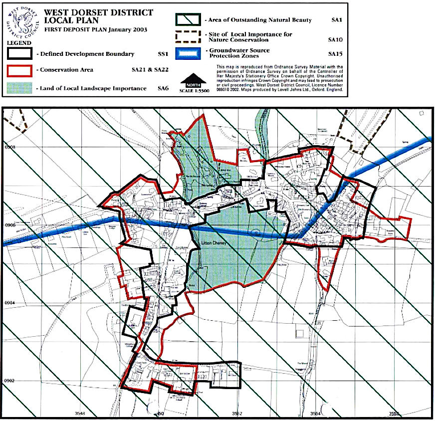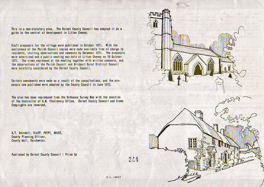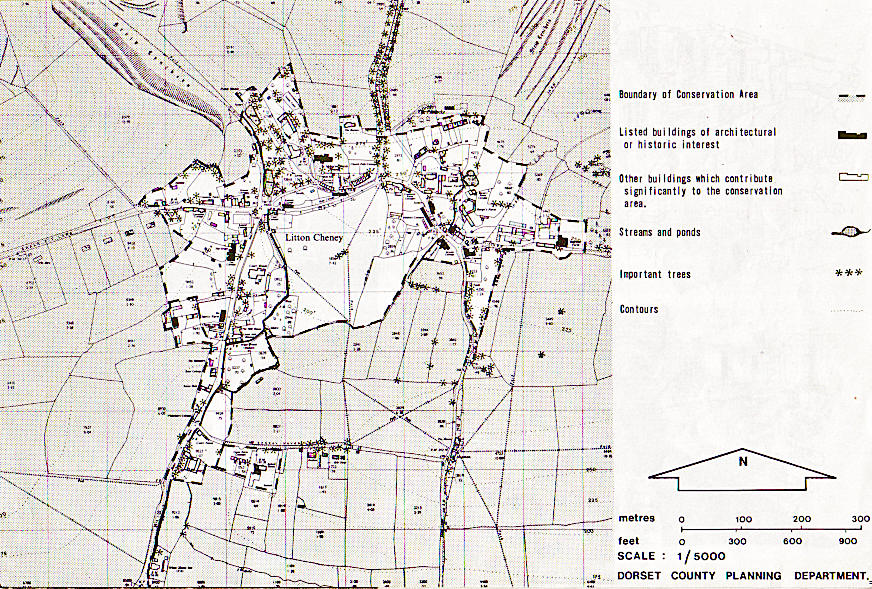 The following is a reproduction of a pamphlet issued by Dorset County Council in 1972, giving details of the Litton Cheney Conservation Area, plus a revised (2003) map, taken from the first WDDC Local Plan. The latter shows the Conservation Area (slightly changed to include Garden Close) together with a “Defined Development Boundary” and “Land of Local Landscape Importance”. No development was to be permitted outside the Defined Development Boundary and only limited infilling inside it. This idea was dropped when the Local Plan was subsequently revised. The 2003 map also indicates that the whole area shown was of Outstanding Natural Beauty.It is included on the website for interest only. It is not known whether all, or any, of its content still applies. Anyone needing up to date details should consult West Dorset District Council’s Planning Department as, since 1972, they have taken over responsibility from Dorset County Council.It is interesting to note that in 1972:•Manor Farm, Barges Farm and Baglake Farm were still in use as intended.•Manor Farm and Baglake estates did not exist.•There was no playing field.•Garden Close was not there.•Fry’s Yard had not been built.•The Garage and its associated bungalow were still there.By 2003 this had all changed.