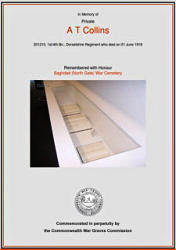 Collins, Albert ThomasBorn in 1885 in Litton Cheney. Baptised on the 26th of December 1885 at Puncknowle.Litton Cheney Bellringer. Married Bessie Foot on 6th June 1913.During the war he was a private with the ¼th Battalion Dorsetshire Regiment. Service No. 201210. He fought in Mesopotamia where he died on the 1st of June 1918.Buried in Baghdad War Cemetery Ref. XII L5