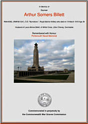 Billett, Arthur SomersBorn on the 20th of July 1882 at Bruton, Somerset, the son of James and Ellen Billett (nee Tilbury). Baptised on the 17th of November 1882 at Bruton.On the 1891 census he is shown as living in Wyke Regis. On the 1901 and 1911 censuses he was recorded at the Eastney Royal Marine Artillery Barracks, Portsmouth.On the 28th of February 1911 he married Laura Minnie Billett of White Cross, Litton Cheney,.She appears on the 1911 Litton Cheney census as Laura Minnie Pitcher, daughter of Louis Pitcher, baker, at White Cross, Litton Cheney.During the war he was a gunner with the Royal Marine Artillery. Service No. RMA/9392 (R.M.R/B/1241) (Po). He died on the 19th of March 1918 aged 36 on SS Burnstone when she was torpedoed by the German submarine UB-62 (Bernhard Putzier). His body was not recovered for burial.Commemorated on Portsmouth Naval Memorial Panel 30.