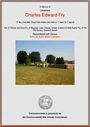 Fry, Charles EdwardCharles Fry, born on 26th December 1881 in Dorchester, Dorset, was the son of Thomas and Anna Fry of “Baglake”, Litton Cheney, Dorset. He was married to Hilda Sophie, née Watson, on 4 September 1916.He attended Dover College 1895-1901, where he was head prefect in his final year. Whilst at Merton he was President of the Boat Club in 1903/4.In 1906, he became an Assistant Classics Master at Manchester Grammar School, and set up the school’s rowing club.On the outbreak of war he applied to become an officer with the Public Schools’ Battalion, returning to Manchester to work with the school’s Officer Training Corps. Gazetted to the Royal Field Artillery, he left for France in 1915.He was killed on 17th April 1917, aged 35, along with three other members of his gun team, by a direct hit during a bombardment near the village of Athies, on the outskirts of Arras.He is buried in Anzin-St Aubin British Cemetery, Pas-de-Calais, France, and is also commemorated on the Cheadle Hulme Memorial (as T C Fry), and on the war memorial at St Mary’s Church, Litton Cheney, Dorset.