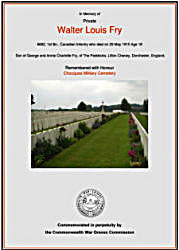 Fry, Walter LouisBorn in 1897, son of George and Annie Charlotte Fry of The Paddocks, Litton Cheney.During the war he was a private with the 1st Battalion, West Ontario Regiment, Canadian Infantry. Service No. 6682He died on the 29th of May 1915 aged 18.Buried in Choques Military Cemetery, Pas de Calais, France I. C. 82