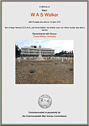 Walker, William Archibald SmailNot found in any census - probably because he lived in India.Born in Dum-Dum India on the 31st of October 1874, the son of Major General Alexander Walker (C.S.I.R.A.) and Anne Yewdale Lambert Smail. Educated at. Dulwich College and Sandhurst.Gazetted 2nd Lieutenant, unattached, Indian Army, on the 10th of October 1804. Attached to the. Was promoted Lieutenant on the 27th November 1897, Captain on the 10th of October 1903, and Major on the 10th of October 1912. He served with the 45th Sikhs and the 40th Pathans and was posted to the 46th Punjabis on their formation.He took part in the operations on the N.W. Frontier of India, 1897-8, including the Defence of Malakand, action at Landakai and operations in Bajaur (medal with two clasps), and in the Tirah Expedition 1897-8 (clasp), and was afterwards employed with the King’s African Rifles from the 25th of November 1903 to 10th of May 1906.After the outbreak of the European War, he was sent,in January 1915, with a double company to British East Africa and attaced to the 130th Baluchis (King George’s Own). He was commmanding a section of the outpost line with headquarters at Mzima on the Tsava River.While visiting sentry groups with an escort of seven men on the 12th of April 1915, he came on the spoor of a large party of Germans. He followed this up for some way in order to- locate the enemy. Whilst returning he was ambushed by a smaller party of Germans, who were following the main force, and he and two men were shot.He was buried on the banks of the Tsava River. The grave was marked by a cairn of stones; the two men who fell with him were buried by his side. A brother officer wrote: “I knew him for a fearless man. He was with my regiment in the Tirah Expedition in 1897. I have never met a braver soldier ”. Another wrote “His escort, Dogras and Gurkhas, five of whom managed to get away, all bear great testimony to his fearlessness and gallantry. He gave the orders with his last breath for his men to scatter; such is necessary in the bush. He is a great loss to us and to our country, we can ill spare such men.”He married, at Peshawar, N.W.P., on the 30th of April 1913, Marion Balfour Crick, youngest daughter of. Frederick William Crick, M.A. rector of Litton Cheney, Dorset. Their daughter Anne Margaret was born on the 21st of January 1914
