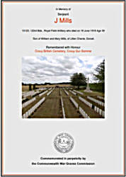 Mills, John His family tree traces John Mill’s ancestors back to Samuel Cook “alias Bidgood”. The alias appearing on his marriage certificate! The family name changed to Mills on his second marriage to Harriet Mills. The family originated from Beaminster. John’s father, William Bidgood, moved to Litton Cheney sometime after 1871. John was born there in August 1878, the son of Willaim and Mary Mills. He married Louisa Rose Courteney on the 19th of November 1908. They had four children before his untimely demise.During the war Sergeant John Mills was a member of 123 Brigade, Royal Field Artillery, Service No. 10123. He died on the 18th of June 1918 aged 39. He is buried at Crouy British Cemetery, Crouy-Sur-Somme, France.Family details HERE