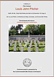 Pitcher, Louis John Louis John Pitcher was born in 1885 at Litton Cheney, the son of Louis and Ellen Pitcher. He does not appear on the Litton Cheney war memorial, his association with the village being through his father, Louis, who owned the bakery at White Cross. The family were living in Winterborn Abbas at the time of his death so presumably they did not think to ask for his name to be included on the war memorial at Litton Cheney.During the war he was a sergeant farrier with 8th Battery Royal Field Artillery, Service No.34255. He died at sea on the troopship SS “Dongola”on the 26th of December 1914, aged 30. The reason for his death is unknown, SS Dongola was not sunk but remained in service until 1929 when it was broken up. He is commemorated on the Hollybrook Memorial, Southampton.Family details HERE