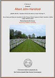 Hansford, Albert John Albert John Hansford was born was born in 1886 at Litton Cheney, the son of Henry and Mary Hansford.He does not appear on the Litton Cheney war memorial. The family were living in Woodford, Essex at the time of his death so presumably they did not think to ask for his name to be included on the memorial at Litton Cheney.Before the war he and his elder brother, George Henry, went to Canada as farmers. He joined the Canadian Infantry (Saskatchewan Regiment), 46th Battalion, Service No. 426238. He was one of 765 who died on the 21st of April 1918 during the Battle of the Lys or 4th Battle of Ypres. He is buried at Roclincourt Military Cemetery, Pas de Calais, France His nephew Albert Henry died in 1942 in the Second World War.Family details HERE
